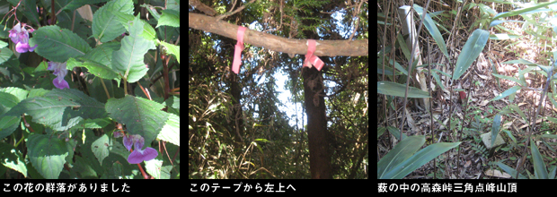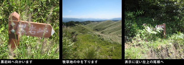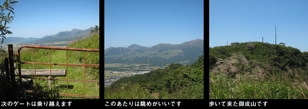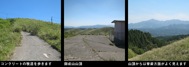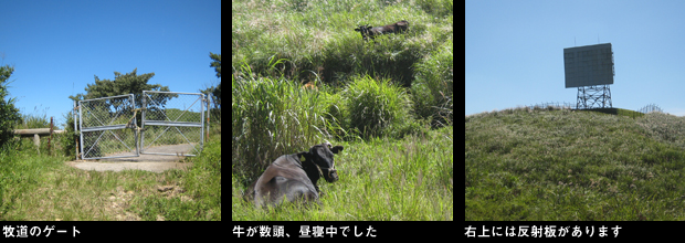 高森峠登山口の表示がある地点から数十メートル先の道路脇から左へ入る荒れた林道が取り付きです。藪気味の林道を歩くとまもなく牧道のゲートがあり脇から中へ入ります。右上の丘の上に反射板がありコンクリートの牧道の坂を上ります。すぐ脇に牛が数頭寝ており、一頭がしばらく後ろからついてきて威嚇します。足早に、左に阿蘇山系の山並みを見ながら強風の中を歩くこと数分で小屋が立つ、コンクリートで周囲を固められた御成山山頂に到着。ここからは南側の展望がよく広い牧草地の山々の向こうに脊梁の稜線がよく見えます。ここから高森峠三角点峰へは、山頂南の角から「黒岩峠へ」と書かれた木柱に従い、牧草地の際を下ります。途中から左の土手に登った先にまたゲートがあり、ここは乗り越します。最近、草刈りがされたばかりの快適な尾根を左の展望(ここからは高森から南阿蘇方面のカルデラが一望できます。)を楽しみながら歩きます。「外輪山コース」と表示のある分岐は直進。樹林に入り左上の山頂を巻き、下り始めた地点の頭上の木の枝にピンクのテープがあり、ここから左上の薮に突入するとそこが高森峠三角点峰山頂でした。展望のない薮の中に三角点がありますが風情のない山です。早々にUターンして往路を戻り、牛の横を慎重に通り車に戻りました。