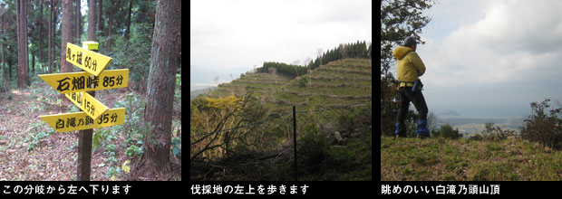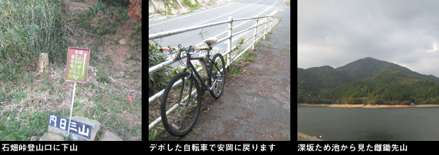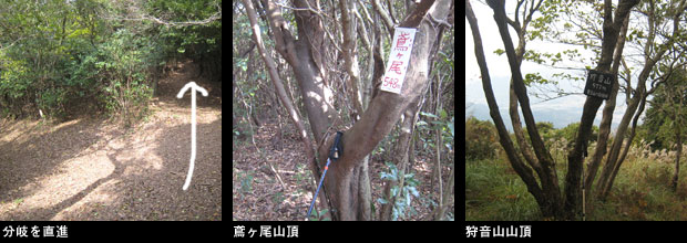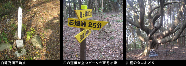 先の分岐を直進、鳶ヶ尾ピーク、狩音山と歩きます。狩音山先の新しい道標が立つ地点からルートは左へ曲がり、こここから自然林の斜面をジグザグに急降下します。やがて右に伐採地を見る地点でルートは平坦になりますが、ここから白滝乃頭という眺めのいいピークへ向けてまた急登です。このピークの三角点は山頂表示からさらに1分ほど歩いた地点にありました。いくつかのアップダウンを越えて、新しい二本目の道標が立つ正月ヶ峰というピークでルートは右折。またロープを頼りに鞍部に急降下し、再度急斜面を登り、変な木が中央に立つ広い樹林の尾根に着きました。木の根元には「川棚のタコおどり」の看板がありこの尾根の縦走記念の撮影ポイントになっているようです。このあたりに来るとやっと車道を走る車の音が聞こえ、この尾根を下るとお地蔵様が2体祀られた背後の石畑峠登山口に下山しました。車道上の側道を歩きデポした峠の自転車の所に到着。スタートしてから6時間40分で目標タイムより少し早く下山することができました。ここからは、自転車で13kmの距離をのんびり深坂ため池などに寄り道しながら走り、15時30分前にスタート地点の駐車地に戻りました。