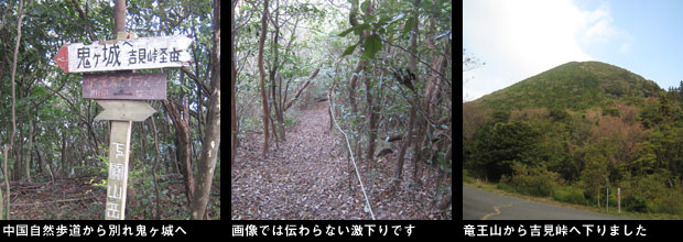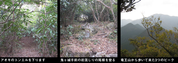 山頂先の分岐から中国自然歩道と分かれ右折し、吉見峠に向けてこれまで稼いだ高度を一気に350m以上も急降下。自然林と人工林の境を凄い斜度でまっすぐ下ります。ロープに掴まりながら慎重に下りますが、こんな下りは初めてで膝が笑うというのを実感できます。ここは登りたくないコースです。やっと下り着いた全行程の中間地点となる吉見峠で、靴ひもを締め直し車道の反対側にある登山口から見上げる尾根に取り付きます。この登りも人工林の中の急斜面の直登コース。中腹からは岩まじりの斜面となりますが斜度は変わりません。振り返ると今下って来た竜王山が大きく背後にそびえています。やっと着いた桜ヶ谷ピークで小休止。さらに先の汐見岩という眺めの良いピークからは黒井方面がよく見えます。ここからは広瀬コブの鞍部にまた下り、またまた登り返します。ここで先行するハイカーが現れました。やがてアオキのトンネルの斜面を下り、鬼ヶ城との鞍部付近このハイカーを追い越しました。私と同じ竜王山南登山口をヘッドライトを頼りに朝6時にスタートしたとそうです。彼を追い越し、鬼ヶ城への激登りのスタートです。岩まじりの斜面を時にロープを頼りにゆるゆる登り、登山口から4時間足らずで広い鬼ヶ城の山頂に着きました。竜王山とは相反して無人の山頂です。西風が時に強く吹き付け、展望を楽しむ余裕もなく、山頂から下った地点にある鬼小屋と呼ばれる避難小屋で風を避けて昼食を摂る事にします。無人の小屋でカップ麺で暖を取りながらの30分の昼食を終え、縦走路に戻ると行く組かのハイカーとすれ違います。その中のお一人は私と同じミレーの同じデザイン、色のザックでお互いあまりの偶然に笑顔で別れました。ここからは地形図を見ると、今までほどの激下り、激登りはないと楽観して歩いていましたがこれは大きな間違いでした。