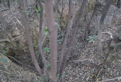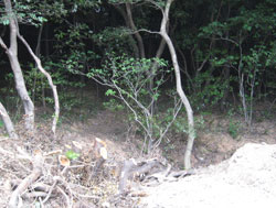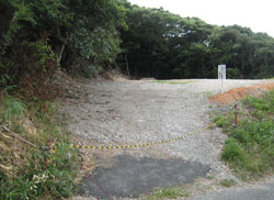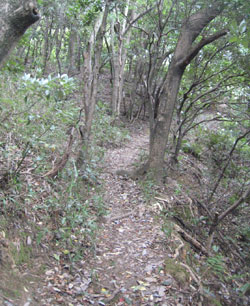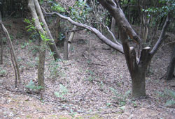 そこでフェンスのとぎれた山の北側から取り付くことにして車道を山に沿って歩くと左にロープがはられた広い空き地がありました。ここをよく調べると左奥に山への踏み跡があります。これに入ると良く歩かれている山道がありこれを歩いてみると西側の住宅地に出ました。地元の方が使う抜け道のようです。少し戻り、左上の山頂に向けて歩き易い雑木の斜面を登ります。するとまあた別の山道に出ました。これをトレースするとまた西の住宅地へ向かい出したので左折して適当に雑木の中を登ります。歩き易い方に登り続けるとひとつのピークに出ましたが遺構はありません。そこで一旦少し戻り、右へ分かれる尾根筋を歩いてみました。途中、倒木がひどく少し斜面を下って巻き、歩き易い所からシダの斜面を登ると明らかに人工的に作られた土手が上に見えてきました。これに登るとそこは深さ1.5m、直径10m以上の土で作られた丸い砲台跡のような場所で反対側に出入り口があります。この塹壕の淵を入口の方へ歩くと、その下の斜面には溝状の通路(?)や深い長方形の塹壕が深い落ち葉に埋もれてひっそりたたずんでいました。この斜面を下った下にコンクリート製の遺構が数多くありそこが筋山公園と呼ばれていた所のようです。この砲台跡を山頂として下山する事にしました。登るときに途中で出会った山道を下ってみると最初に取り付いた空き地の車道に近い所に出ました。