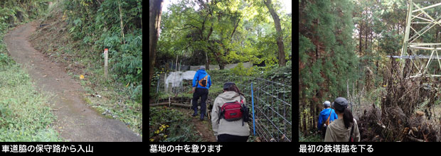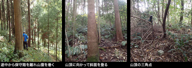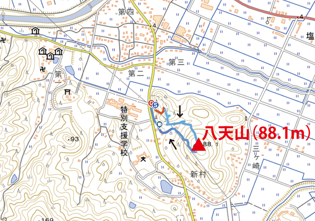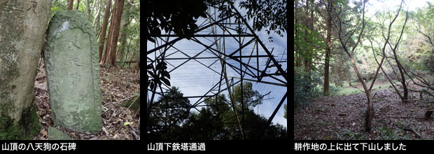 弁才山から下山後、和泉式部公園の東に位置する送電線鉄塔が数基建つ山、八天山に登ります。この山は事前調査で山頂の北西の車道から保守路があることが判明しており、ここから取り付きましたが、結論から言うとこの保守路は山頂下の送電線にはつながっておらず墓地に上がり先の集落に下るだけで、私たちは集落上から獣道を利用して適当にシダの多い稜線を山頂へ登ることにしました。登り上がった山頂には三角点があり、中央には「八天狗」と掘られた石碑が唐泉山の方向に向かって建っていました。この石碑がこの山の由来のようです。山頂からは西側の山頂下の送電線に下り、ここからは適当に集落に向けて斜面を下り、耕作地上に出て下山しました。下山後、麓の集落の方々に山のことを伺うと地元では「三ヶ崎山」と呼ばれていることが判明。これは、九大の「しこ名」調査の文献とも合致するようです。